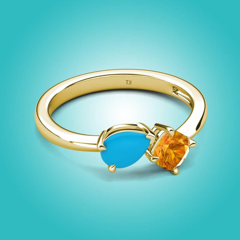 The Turquoise Pear Shape and Citrine Cushion Shape Two Stone Engagement Ring of 0.85 ctw set in a Prong setting, is a stunning piece of jewelry that features a unique "Toi et Moi" design, which means "You and Me" in French, symbolizing the union of two souls in love and giving a comfort fit to the wearer.