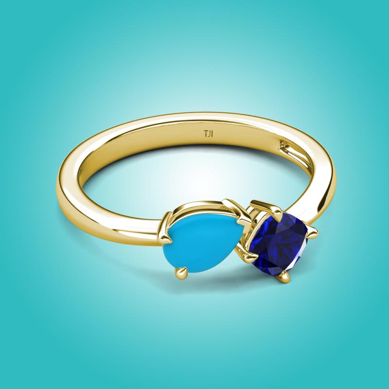 1.16 ctw Turquoise Pear Shape 7x5 mm & Lab Created Blue Sapphire Cushion Shape 5.00 mm with Prong setting Two Stone Duo Women Engagement Ring in 18K Yellow Gold More Details ...