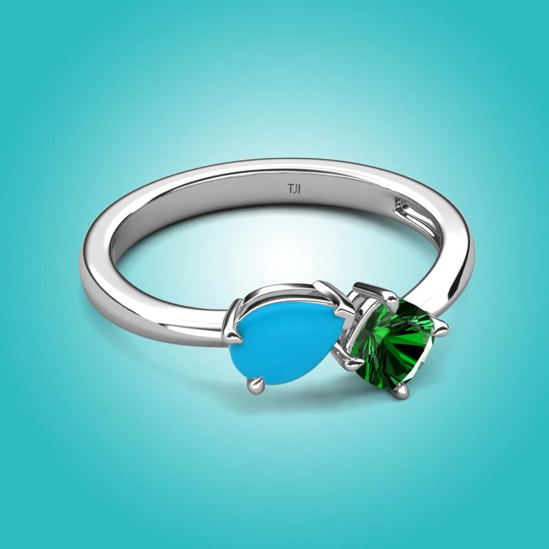 The Turquoise Pear Shape and Lab Created Emerald Cushion Shape Two Stone Engagement Ring of 0.90 ctw set in a Prong setting, is a stunning piece of jewelry that features a unique "Toi et Moi" design, which means "You and Me" in French, symbolizing the union of two souls in love and giving a comfort fit to the wearer.