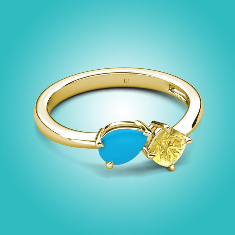 The Turquoise Pear Shape and Lab Created Yellow Sapphire Cushion Shape Two Stone Engagement Ring of 1.16 ctw set in a Prong setting, is a stunning piece of jewelry that features a unique "Toi et Moi" design, which means "You and Me" in French, symbolizing the union of two souls in love and giving a comfort fit to the wearer.