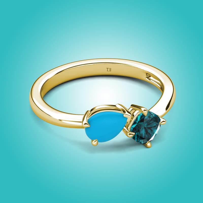 1.10 ctw Turquoise Pear Shape 7x5 mm & London Blue Topaz Cushion Shape 5.00 mm with Prong setting Two Stone Duo Women Engagement Ring in 18K Yellow Gold More Details ...