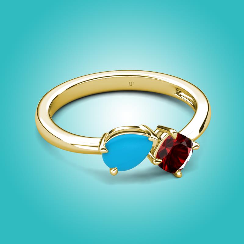 1.10 ctw Turquoise Pear Shape 7x5 mm & Red Garnet Cushion Shape 5.00 mm with Prong setting Two Stone Duo Women Engagement Ring in 14K Yellow Gold More Details ...