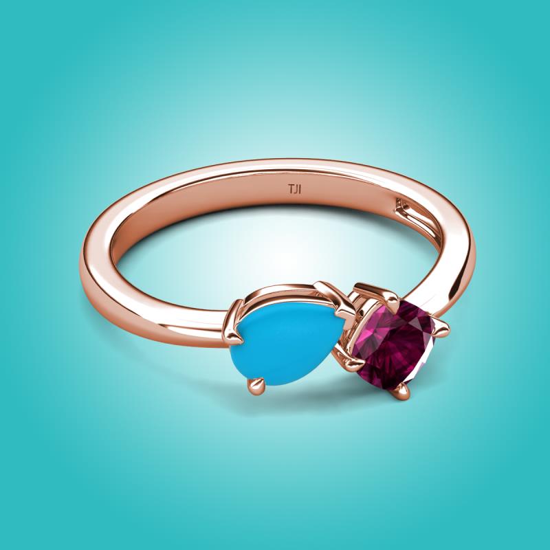 The Turquoise Pear Shape and Rhodolite Garnet Cushion Shape Two Stone Engagement Ring of 0.97 ctw set in a Prong setting, is a stunning piece of jewelry that features a unique "Toi et Moi" design, which means "You and Me" in French, symbolizing the union of two souls in love and giving a comfort fit to the wearer.
