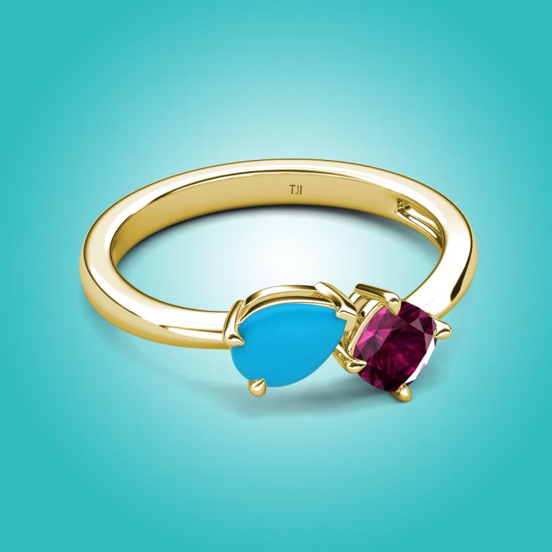 0.97 ctw Turquoise Pear Shape 7x5 mm & Rhodolite Garnet Cushion Shape 5.00 mm with Prong setting Two Stone Duo Women Engagement Ring in 14K Yellow Gold More Details ...