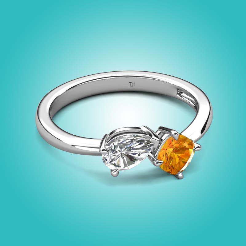 The White Sapphire Pear Shape and Citrine Cushion Shape Two Stone Engagement Ring of 1.40 ctw set in a Prong setting, is a stunning piece of jewelry that features a unique "Toi et Moi" design, which means "You and Me" in French, symbolizing the union of two souls in love and giving a comfort fit to the wearer.