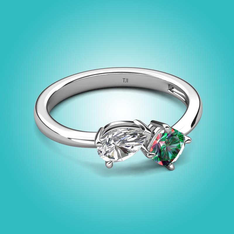 The White Sapphire Pear Shape and Lab Created Alexandrite Cushion Shape Two Stone Engagement Ring of 1.71 ctw set in a Prong setting, is a stunning piece of jewelry that features a unique "Toi et Moi" design, which means "You and Me" in French, symbolizing the union of two souls in love and giving a comfort fit to the wearer.