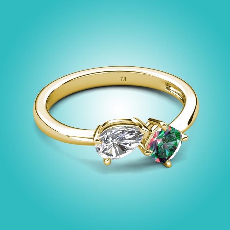1.71 ctw White Sapphire Pear Shape 7x5 mm & Lab Created Alexandrite Cushion Shape 5.00 mm with Prong setting Two Stone Duo Women Engagement Ring in 18K Yellow Gold More Details ...