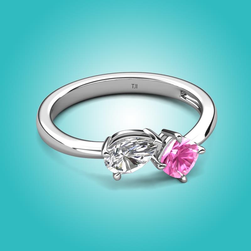 The White Sapphire Pear Shape and Lab Created Pink Sapphire Cushion Shape Two Stone Engagement Ring of 1.71 ctw set in a Prong setting, is a stunning piece of jewelry that features a unique "Toi et Moi" design, which means "You and Me" in French, symbolizing the union of two souls in love and giving a comfort fit to the wearer.
