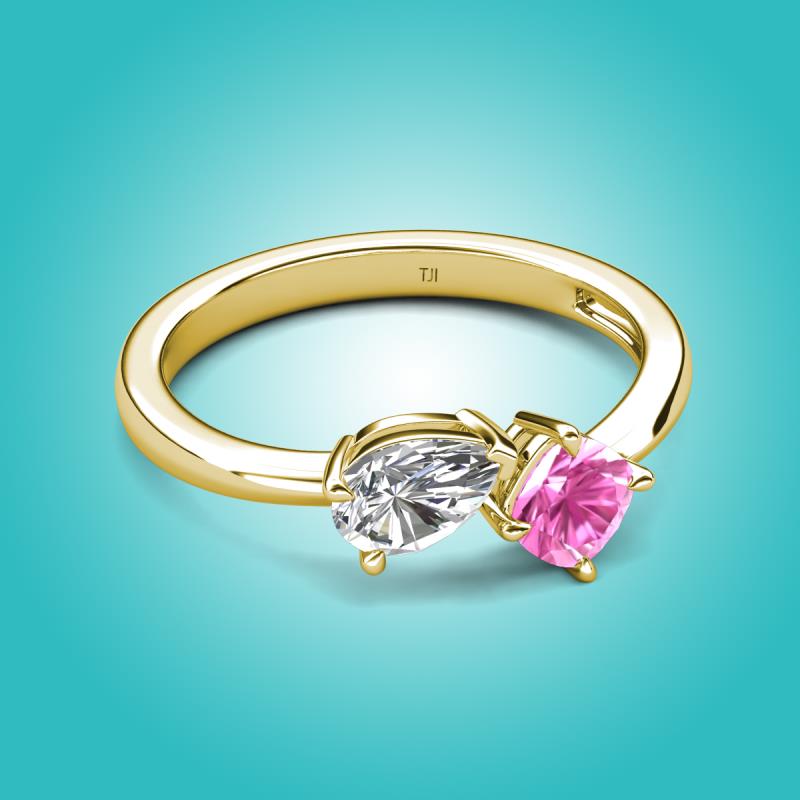 1.71 ctw White Sapphire Pear Shape 7x5 mm & Lab Created Pink Sapphire Cushion Shape 5.00 mm with Prong setting Two Stone Duo Women Engagement Ring in 18K Yellow Gold More Details ...
