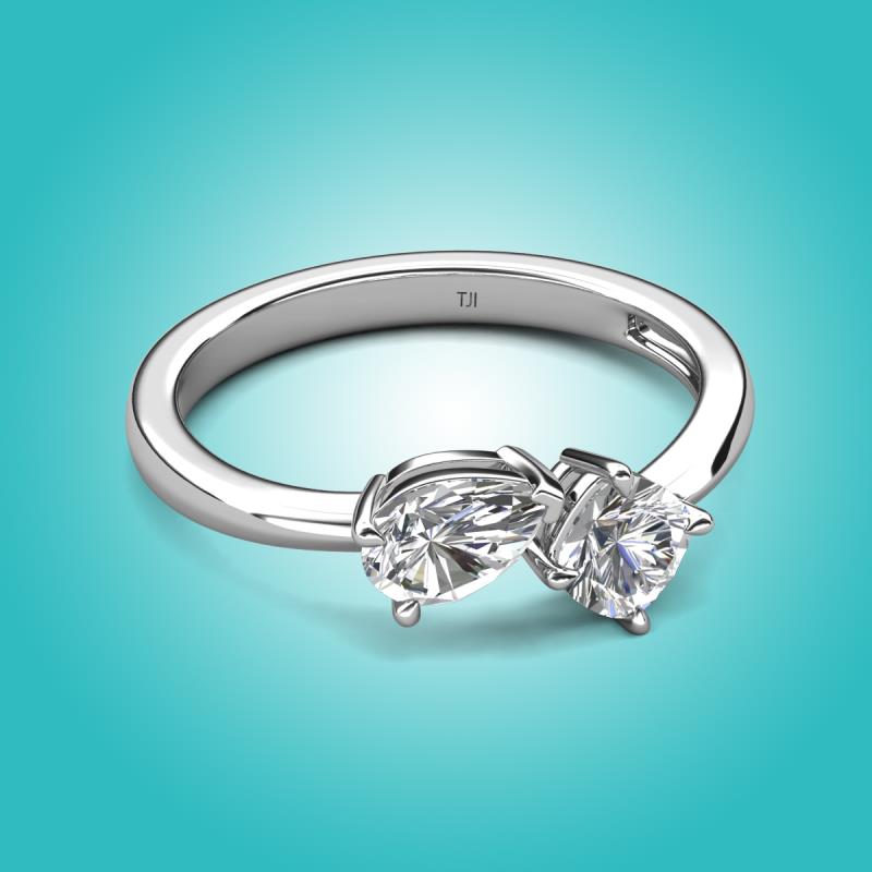 The White Sapphire Pear Shape and Natural Diamond Cushion Shape Two Stone Engagement Ring of 1.40 ctw set in a Prong setting, is a stunning piece of jewelry that features a unique "Toi et Moi" design, which means "You and Me" in French, symbolizing the union of two souls in love and giving a comfort fit to the wearer.