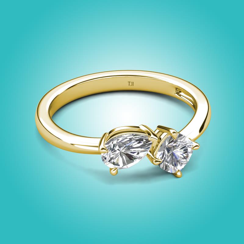 The White Sapphire Pear Shape and Natural Diamond Cushion Shape Two Stone Engagement Ring of 1.40 ctw set in a Prong setting, is a stunning piece of jewelry that features a unique "Toi et Moi" design, which means "You and Me" in French, symbolizing the union of two souls in love and giving a comfort fit to the wearer.
