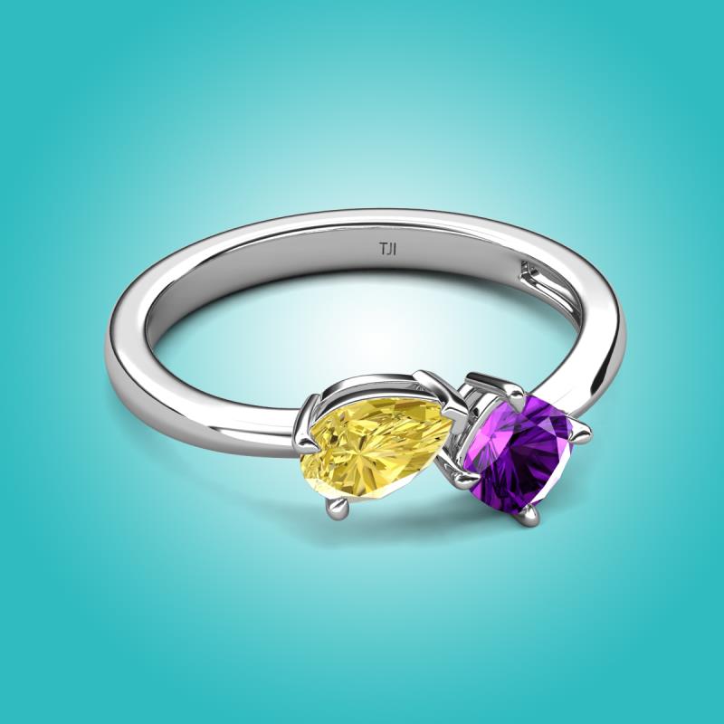 The Yellow Sapphire Pear Shape and Amethyst Cushion Shape Two Stone Engagement Ring of 1.40 ctw set in a Prong setting, is a stunning piece of jewelry that features a unique "Toi et Moi" design, which means "You and Me" in French, symbolizing the union of two souls in love and giving a comfort fit to the wearer.