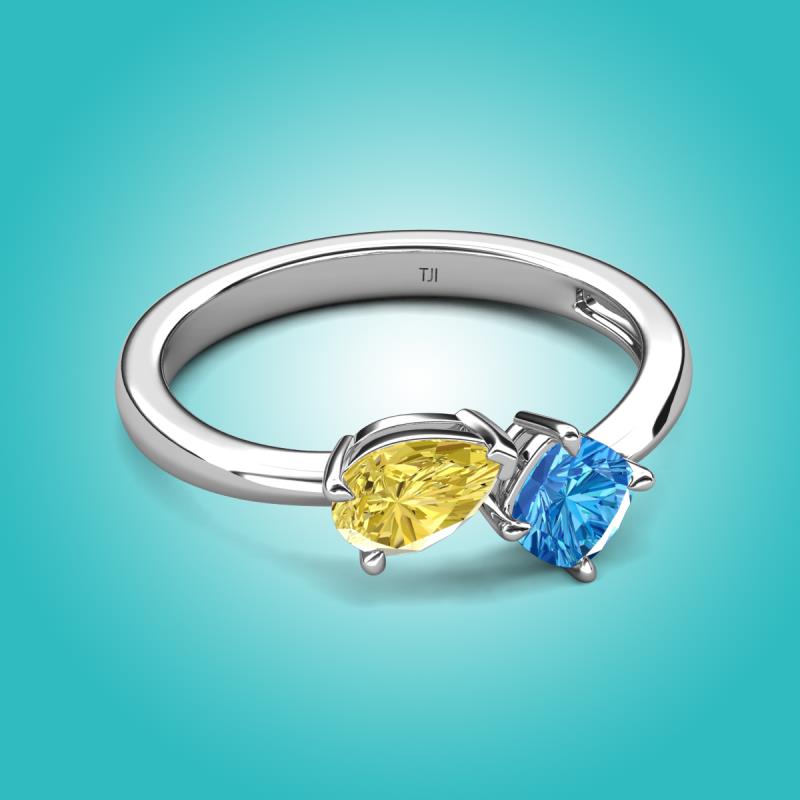 1.65 ctw Yellow Sapphire Pear Shape 7x5 mm & Blue Topaz Cushion Shape 5.00 mm with Prong setting Two Stone Duo Women Engagement Ring in 18K White Gold More Details ...