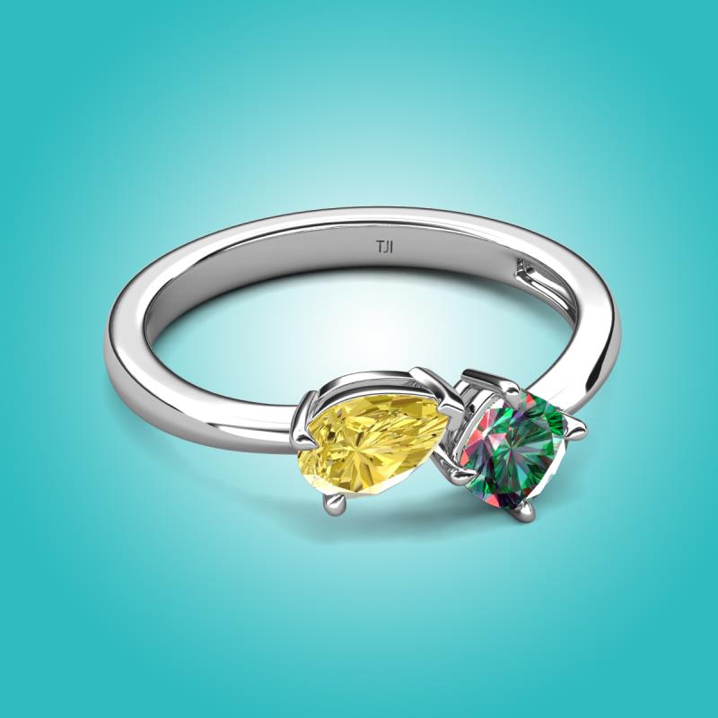 The Yellow Sapphire Pear Shape and Lab Created Alexandrite Cushion Shape Two Stone Engagement Ring of 1.71 ctw set in a Prong setting, is a stunning piece of jewelry that features a unique "Toi et Moi" design, which means "You and Me" in French, symbolizing the union of two souls in love and giving a comfort fit to the wearer.