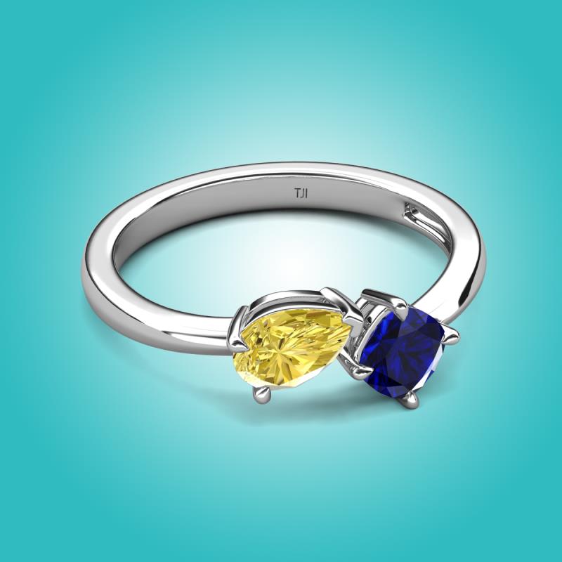 The Yellow Sapphire Pear Shape and Lab Created Blue Sapphire Cushion Shape Two Stone Engagement Ring of 1.71 ctw set in a Prong setting, is a stunning piece of jewelry that features a unique "Toi et Moi" design, which means "You and Me" in French, symbolizing the union of two souls in love and giving a comfort fit to the wearer.