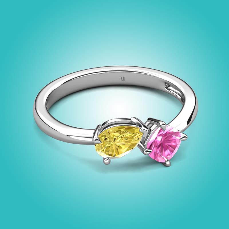 The Yellow Sapphire Pear Shape and Lab Created Pink Sapphire Cushion Shape Two Stone Engagement Ring of 1.71 ctw set in a Prong setting, is a stunning piece of jewelry that features a unique "Toi et Moi" design, which means "You and Me" in French, symbolizing the union of two souls in love and giving a comfort fit to the wearer.