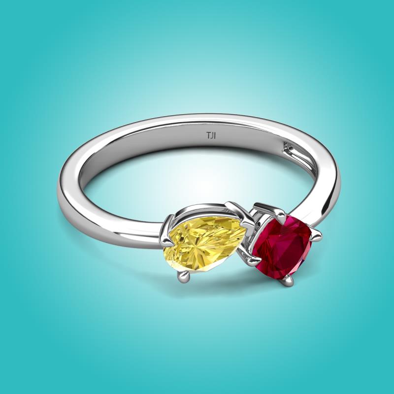 The Yellow Sapphire Pear Shape and Lab Created Ruby Cushion Shape Two Stone Engagement Ring of 1.71 ctw set in a Prong setting, is a stunning piece of jewelry that features a unique "Toi et Moi" design, which means "You and Me" in French, symbolizing the union of two souls in love and giving a comfort fit to the wearer.