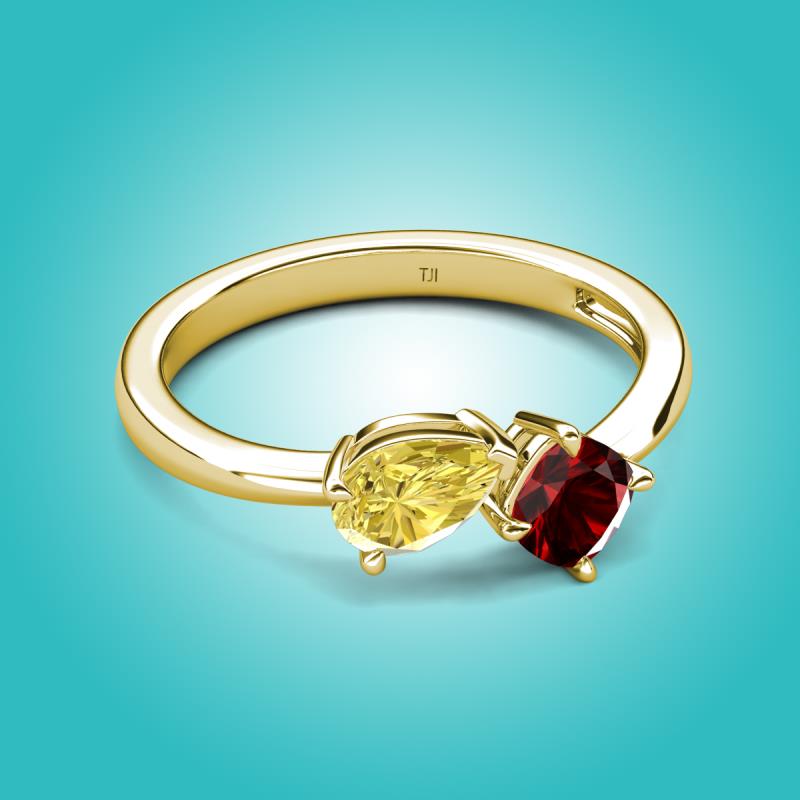 1.65 ctw Yellow Sapphire Pear Shape 7x5 mm & Red Garnet Cushion Shape 5.00 mm with Prong setting Two Stone Duo Women Engagement Ring in 14K Yellow Gold More Details ...