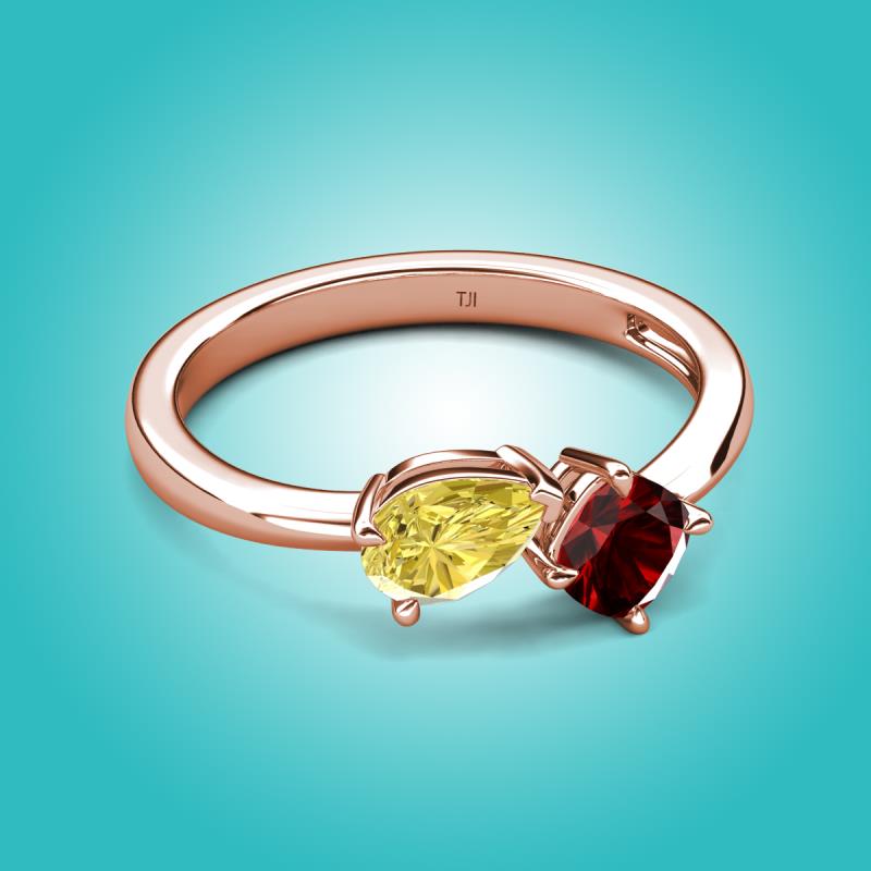 1.65 ctw Yellow Sapphire Pear Shape 7x5 mm & Red Garnet Cushion Shape 5.00 mm with Prong setting Two Stone Duo Women Engagement Ring in 18K Rose Gold More Details ...