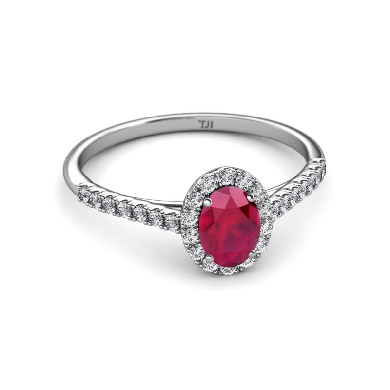 7x5 mm Oval Ruby and Lab Grown Diamond Halo Engagement Ring 1.32 ctw in 18K White Gold. More Details ...