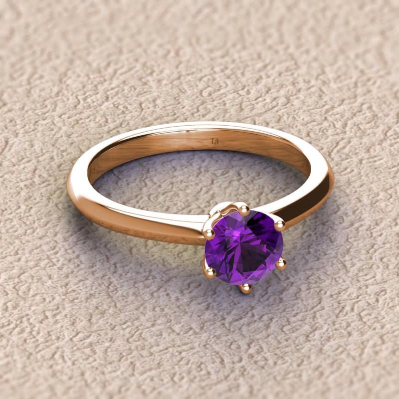 This glamorous solitaire engagement ring in 14K Rose Gold is designed with a modern knife edge style to hold the center Amethyst with Six Prongs setting for a beautiful look.