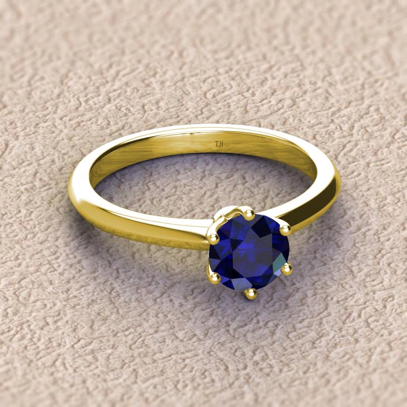 This glamorous solitaire engagement ring in 14K Yellow Gold is designed with a modern knife edge style to hold the center Blue Sapphire with Six Prongs setting for a beautiful look.