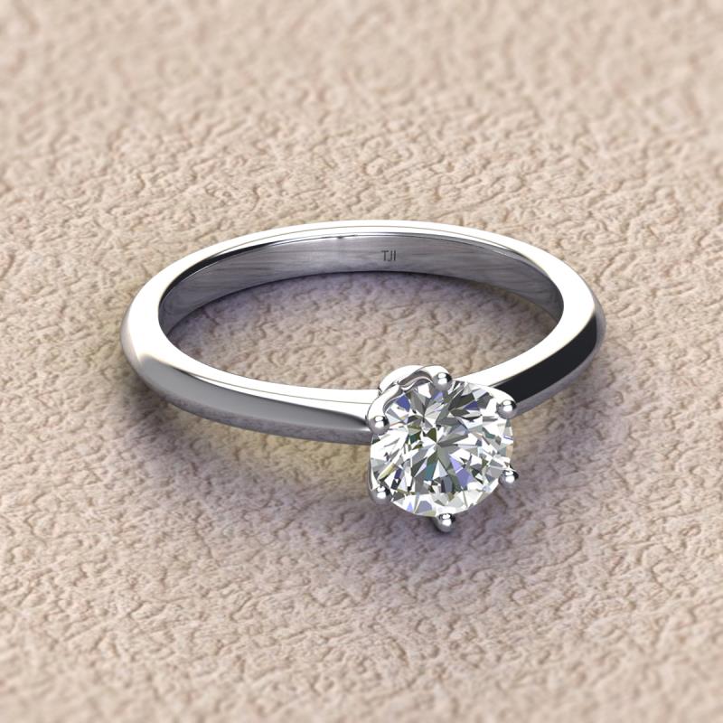 This glamorous solitaire engagement ring in 18K White Gold is designed with a modern knife edge style to hold the center Diamond with Six Prongs setting for a beautiful look.