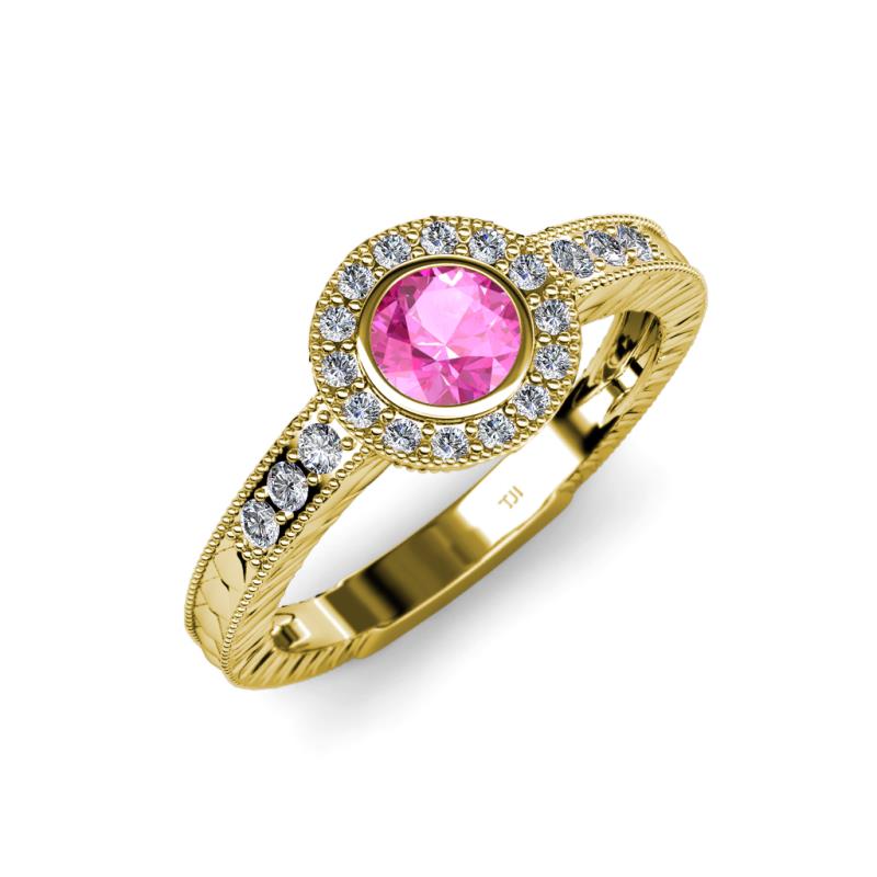 Lab Created Pink Sapphire and Diamond Engraved Womens Halo Engagement Ring 0.77 ctw 14K Yellow Gold More Details ...