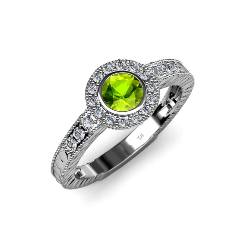 Peridot and Diamond Engraved Milgrain Womens Halo Engagement Ring 0.74 ctw Platinum More Details ...