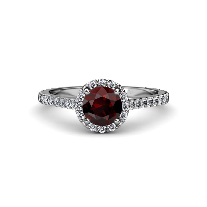 Engage with your Love with this remarkable Ring where Red Garnet is embraced by gleaming halo of Diamonds which continue their way through the shank showcasing your everlasting Love.