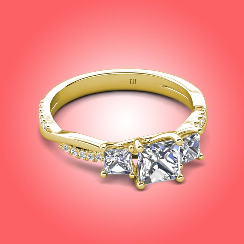 Gorgeous 3 Stone Princess Cut Lab Grown Diamond accented Diamond Twisted Vine Engagement Ring in 18K Yellow Gold More Details ...