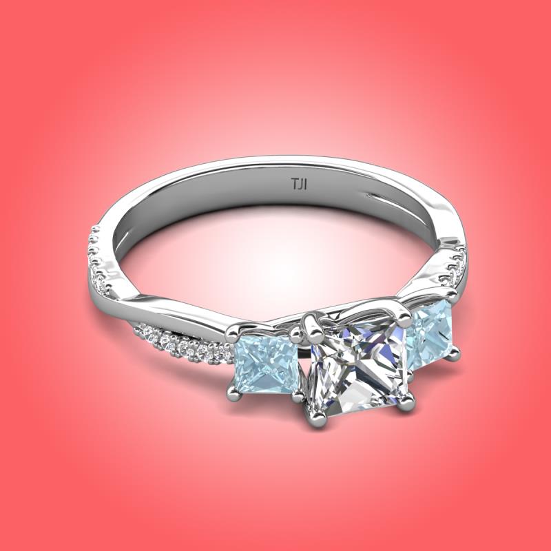 Gorgeous 3 Stone Princess Cut Lab Grown Diamond and Aquamarine accented Diamond Twisted Vine Engagement Ring in Sterling Silver More Details ...