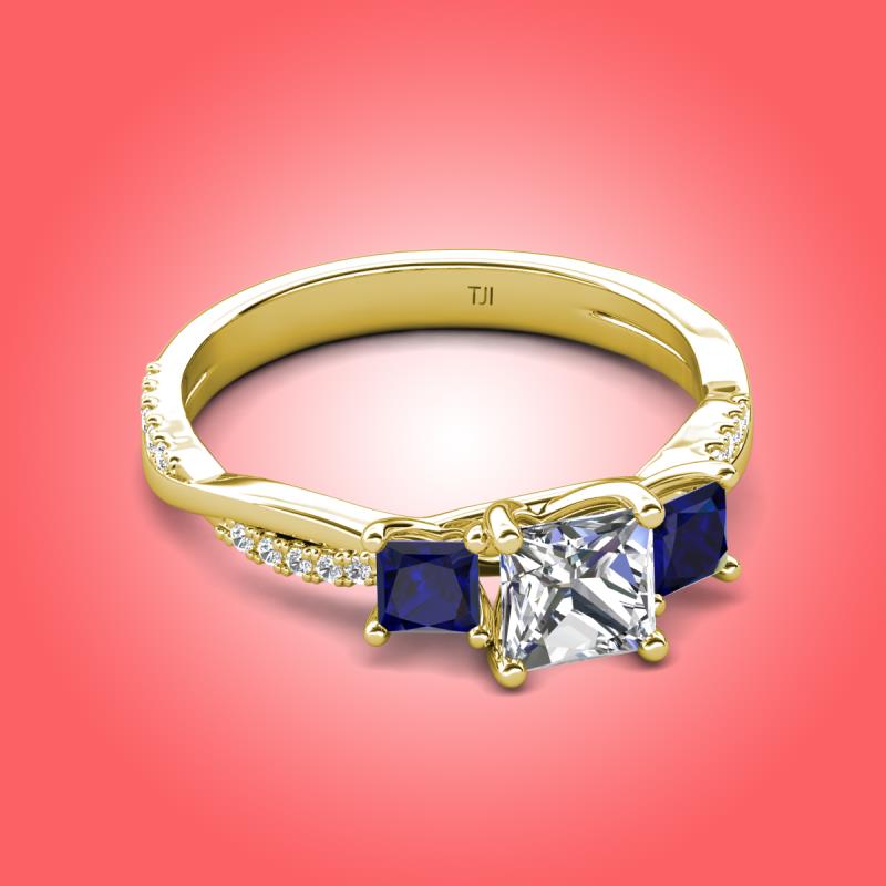 Gorgeous 3 Stone Princess Cut Lab Grown Diamond and Blue Sapphire accented Diamond Twisted Vine Engagement Ring in 18K Yellow Gold More Details ...