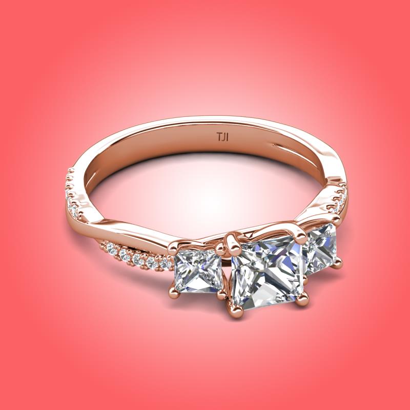 Gorgeous 3 Stone Princess Cut Lab Grown Diamond and Natural Diamond accented Diamond Twisted Vine Engagement Ring in 18K Rose Gold More Details ...