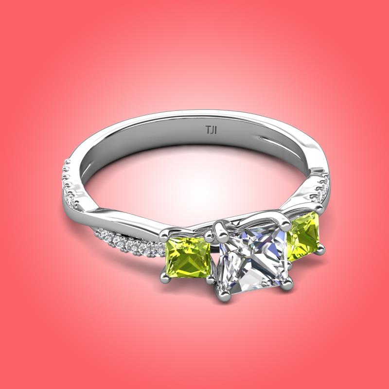 Gorgeous 3 Stone Princess Cut Lab Grown Diamond and Peridot accented Diamond Twisted Vine Engagement Ring in Sterling Silver More Details ...