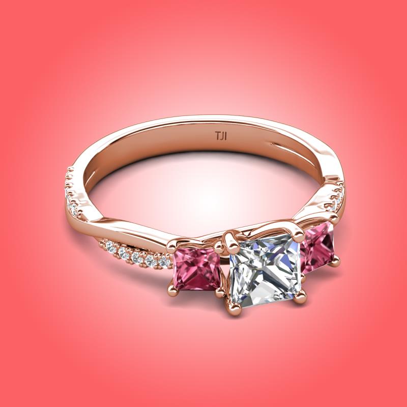 Gorgeous 3 Stone Princess Cut Lab Grown Diamond and Pink Tourmaline accented Diamond Twisted Vine Engagement Ring in 14K Rose Gold More Details ...