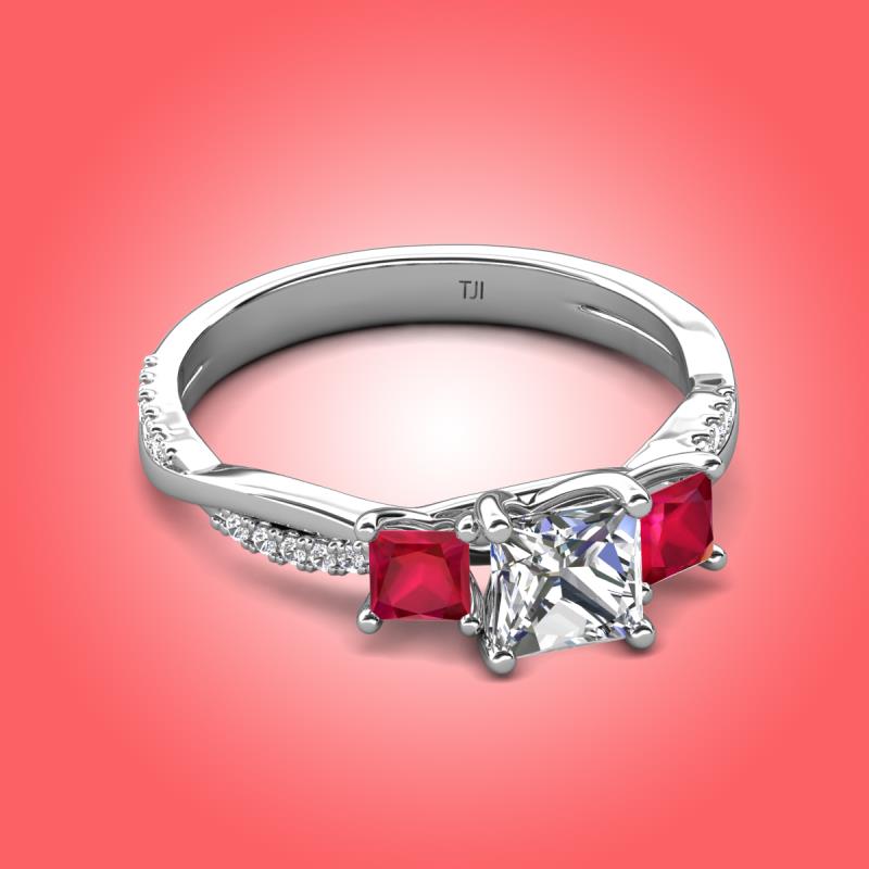 Gorgeous 3 Stone Princess Cut Lab Grown Diamond and Ruby accented Diamond Twisted Vine Engagement Ring in 18K White Gold More Details ...