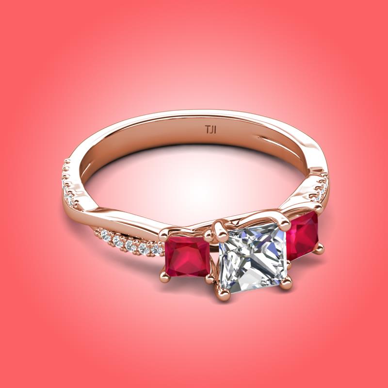 Gorgeous 3 Stone Princess Cut Lab Grown Diamond and Ruby accented Diamond Twisted Vine Engagement Ring in 18K Rose Gold More Details ...