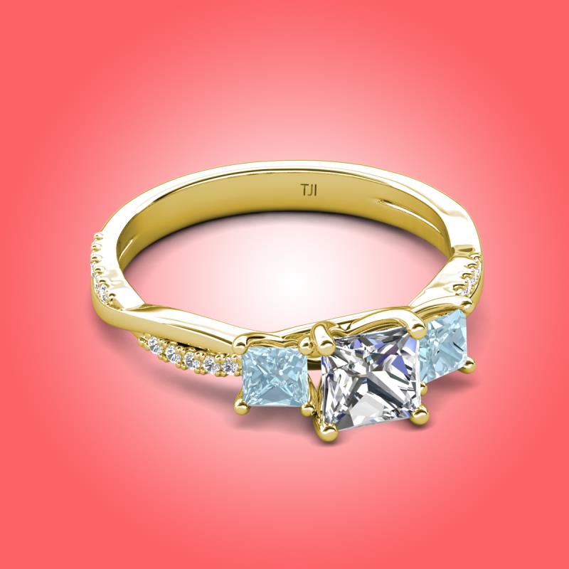 Gorgeous 3 Stone Princess Cut Natural Diamond and Aquamarine accented Diamond Twisted Vine Engagement Ring in 14K Yellow Gold More Details ...