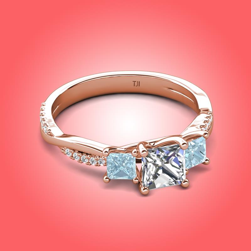 Gorgeous 3 Stone Princess Cut Natural Diamond and Aquamarine accented Diamond Twisted Vine Engagement Ring in 14K Rose Gold More Details ...