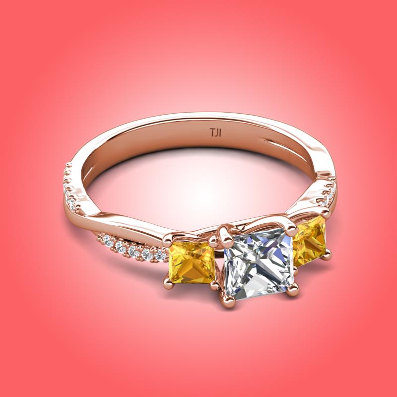 Gorgeous 3 Stone Princess Cut Natural Diamond and Citrine accented Diamond Twisted Vine Engagement Ring in 14K Rose Gold More Details ...
