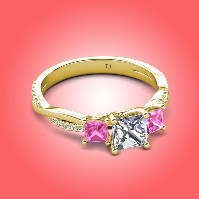Gorgeous 3 Stone Princess Cut Natural Diamond and Pink Sapphire accented Diamond Twisted Vine Engagement Ring in 14K Yellow Gold More Details ...
