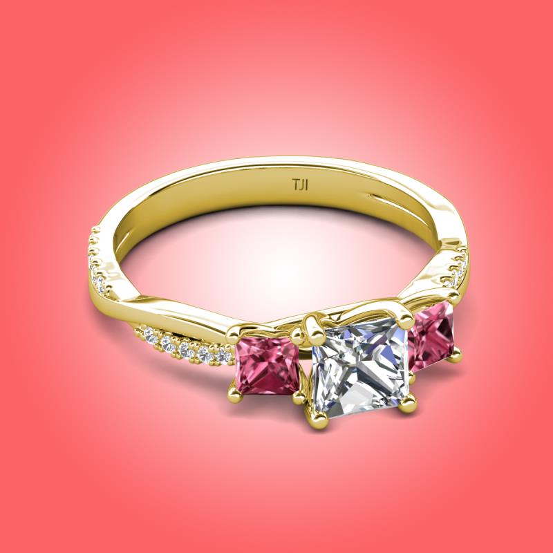 Gorgeous 3 Stone Princess Cut Natural Diamond and Pink Tourmaline accented Diamond Twisted Vine Engagement Ring in 14K Yellow Gold More Details ...