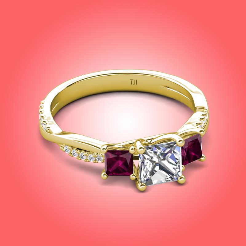 Gorgeous 3 Stone Princess Cut Natural Diamond and Rhodolite Garnet accented Diamond Twisted Vine Engagement Ring in 18K Yellow Gold More Details ...
