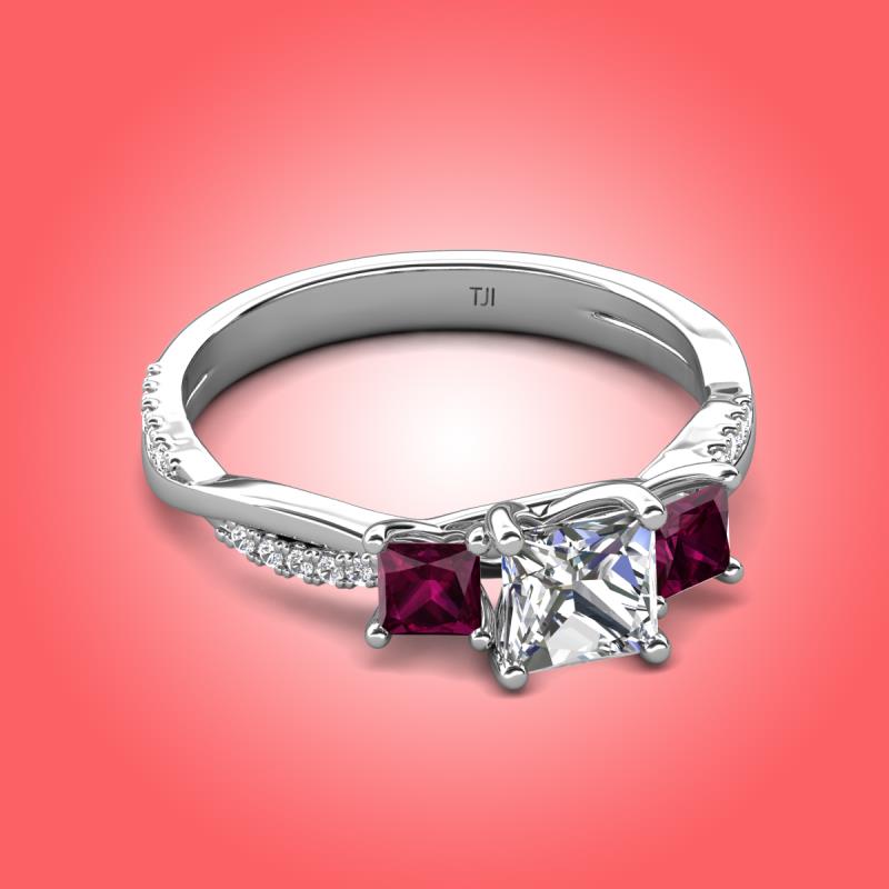 Every love story is beautiful, so make yours the most favourite one with this Engagement ring of 1.56 ctw Princess Cut Natural Diamond with Rhodolite Garnet Side Stone and Side Natural Diamond Twisted Vine Engagement Ring set in a Prong setting.