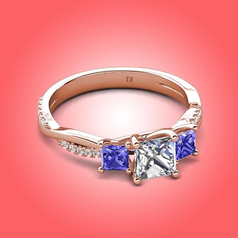 Gorgeous 3 Stone Princess Cut Natural Diamond and Tanzanite accented Diamond Twisted Vine Engagement Ring in 18K Rose Gold More Details ...