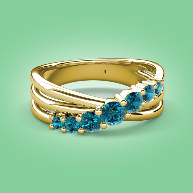 Make a statement with this stunning Wedding Band of 0.49 ctw featuring 7 sparkling Graduated Round Blue Diamond set in a Prong Set with a crossover design, adding a touch of elegance and sophistication to any outfit.