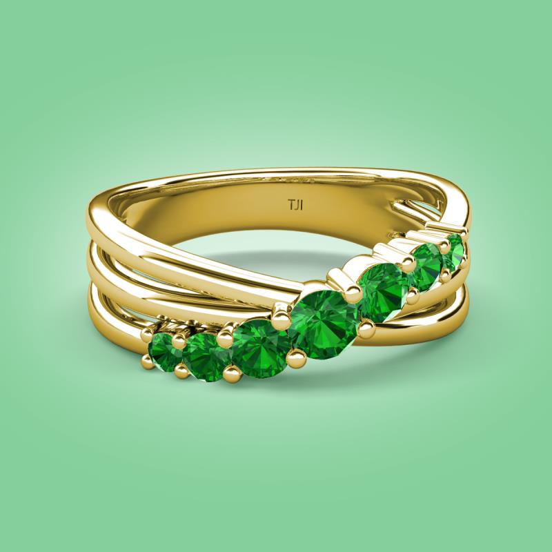 Make a statement with this stunning Wedding Band of 0.59 ctw featuring 7 sparkling Graduated Round Green Garnet set in a Prong Set with a crossover design, adding a touch of elegance and sophistication to any outfit.