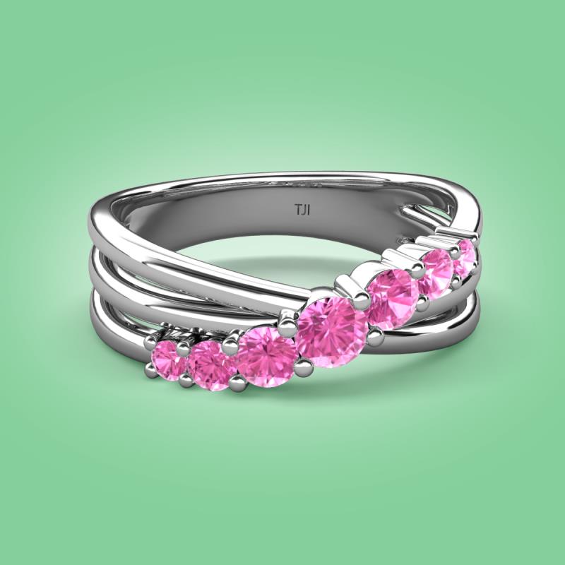 Make a statement with this stunning Wedding Band of 0.53 ctw featuring 7 sparkling Graduated Round Pink Sapphire set in a Prong Set with a crossover design, adding a touch of elegance and sophistication to any outfit.