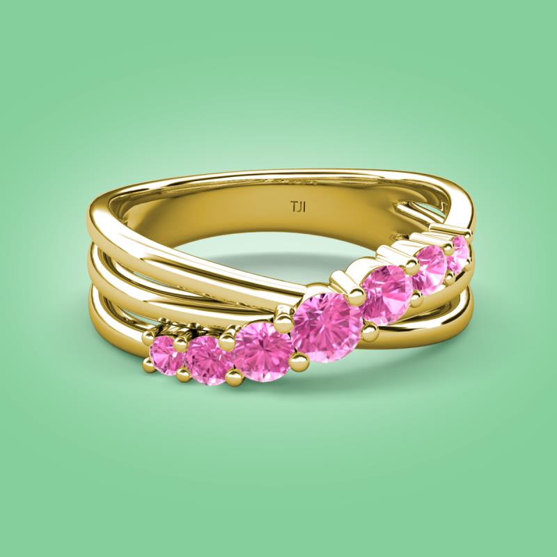Make a statement with this stunning Wedding Band of 0.53 ctw featuring 7 sparkling Graduated Round Pink Sapphire set in a Prong Set with a crossover design, adding a touch of elegance and sophistication to any outfit.